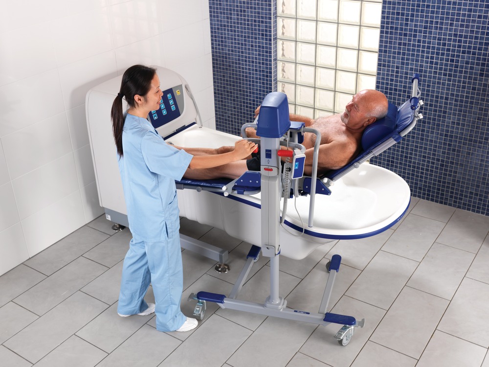 Wyścielane leże o pełnej długości podtrzymuje całe ciało pensjonariusza, umożliwiając opiekunowi przeniesienie go z krawędzi łóżka bezpośrednio do wanny i z powrotem bez konieczności ręcznego podnoszenia i dodatkowego przenoszenia, zapewniając efektywną alternatywę dla mycia w łóżku.