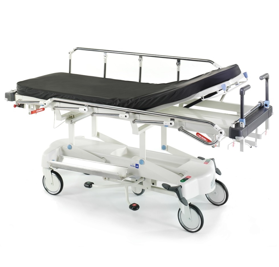Leże wózka przezierne na całej długości dla promieni RTG. Regulowane oparcie pleców wspomagane sprężyną gazową. Regulacja wysokości za pomocą pedałów umieszczonych po obu stronach wózka. Dźwignia ustawiania pozycji Trendelenburga przy wezgłowiu. Centralny hamulec z dźwigniami aktywowany w dwóch narożnikach. Od strony głowy dwa uchwyty do manewrowania o regulowanej wysokości. Odbojniki w narożnikach. Zintegrowane barierki boczne opuszczane do poziomu leża wózka. Miejsce na rzeczy osobiste pacjenta. Cztery koła o średnicy 20 cm. Regulacje: pozycja Trendelenburga, kąt segmentu oparcia pleców, wysokość.