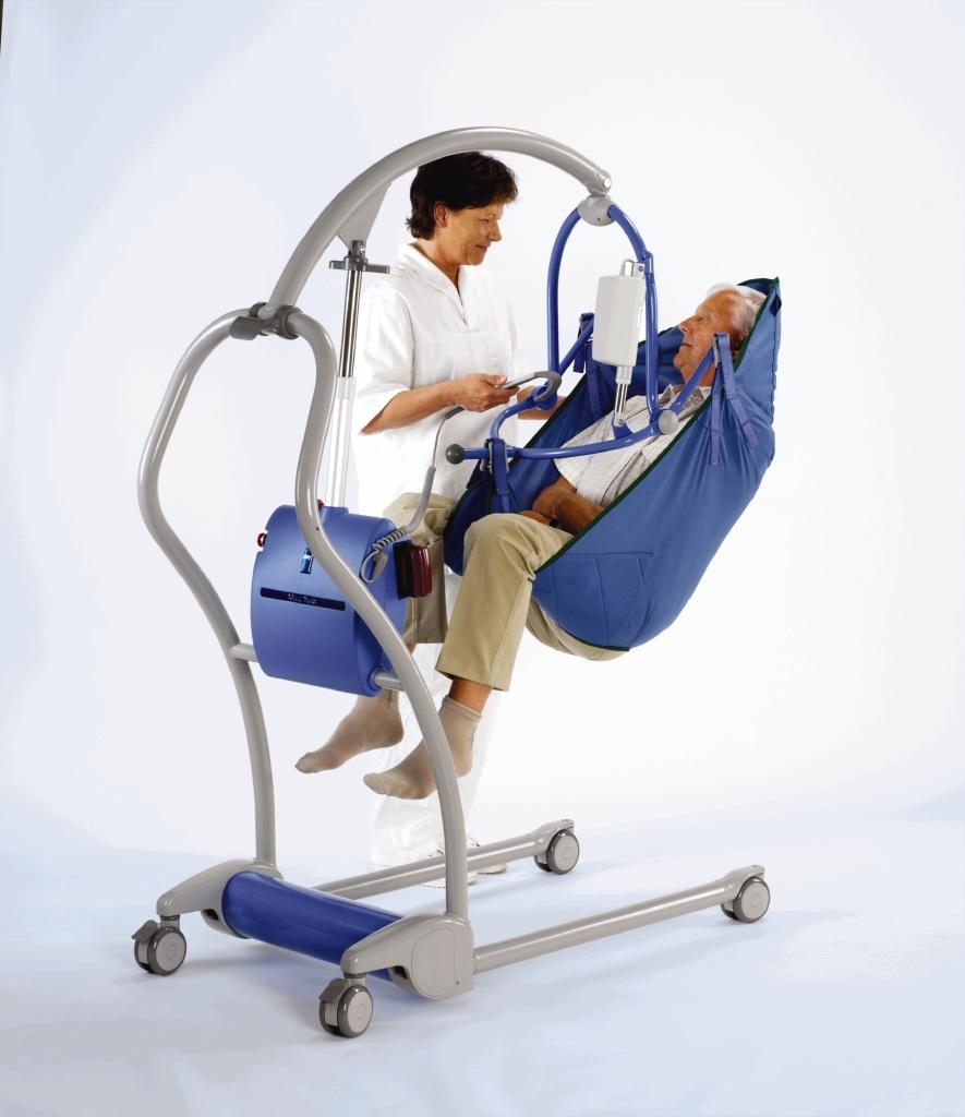 Zasilanie akumulatorowe, dwukolumnowy maszt zapobiegający kontaktowi ze stopami pacjenta.