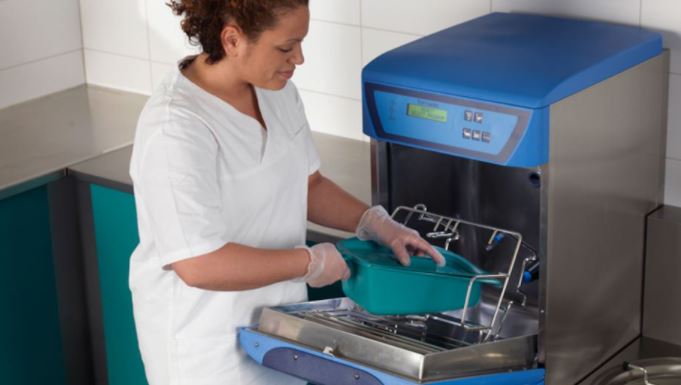 Urządzenie ładowane od przodu opróżnia, czyści i dezynfekuje naczynia sanitarne. W jednym cyklu można maksymalnie wyczyścić 3 kaczki; 1 basen; lub 1 kaczkę i 1 basen