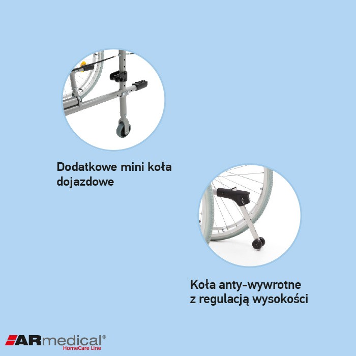 Dzięki bardzo bogatemu wyposażeniu (hamulec dla opiekuna, hamulec dla pacjenta, regulacja środka ciężkości, regulacja wysokości „rączek” dla opiekuna, uchylne podłokietniki z regulacją wysokości, mini koła dojazdowe, kółka anty-wywrotne z regulacją wysokości, pas bezpieczeństwa, odpinana poduszka do siedzenia) i bardzo solidnemu standardowi wykonania, wózek będzie niezwykle praktyczny i pomocny w życiu codziennym osoby niepełnosprawnej lub osoby mającej problem z narządem ruchu.