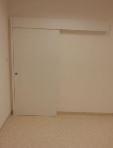 Drzwi RTG przesuwne wykonane z płyty wiórowej laminowanej (pełne) na solidnym systemie jezdnym wytrzymującym udźwig 200kg. Drzwi wyposażone w zamek hakowy. Ościeżnica regulowana na szerokość muru.