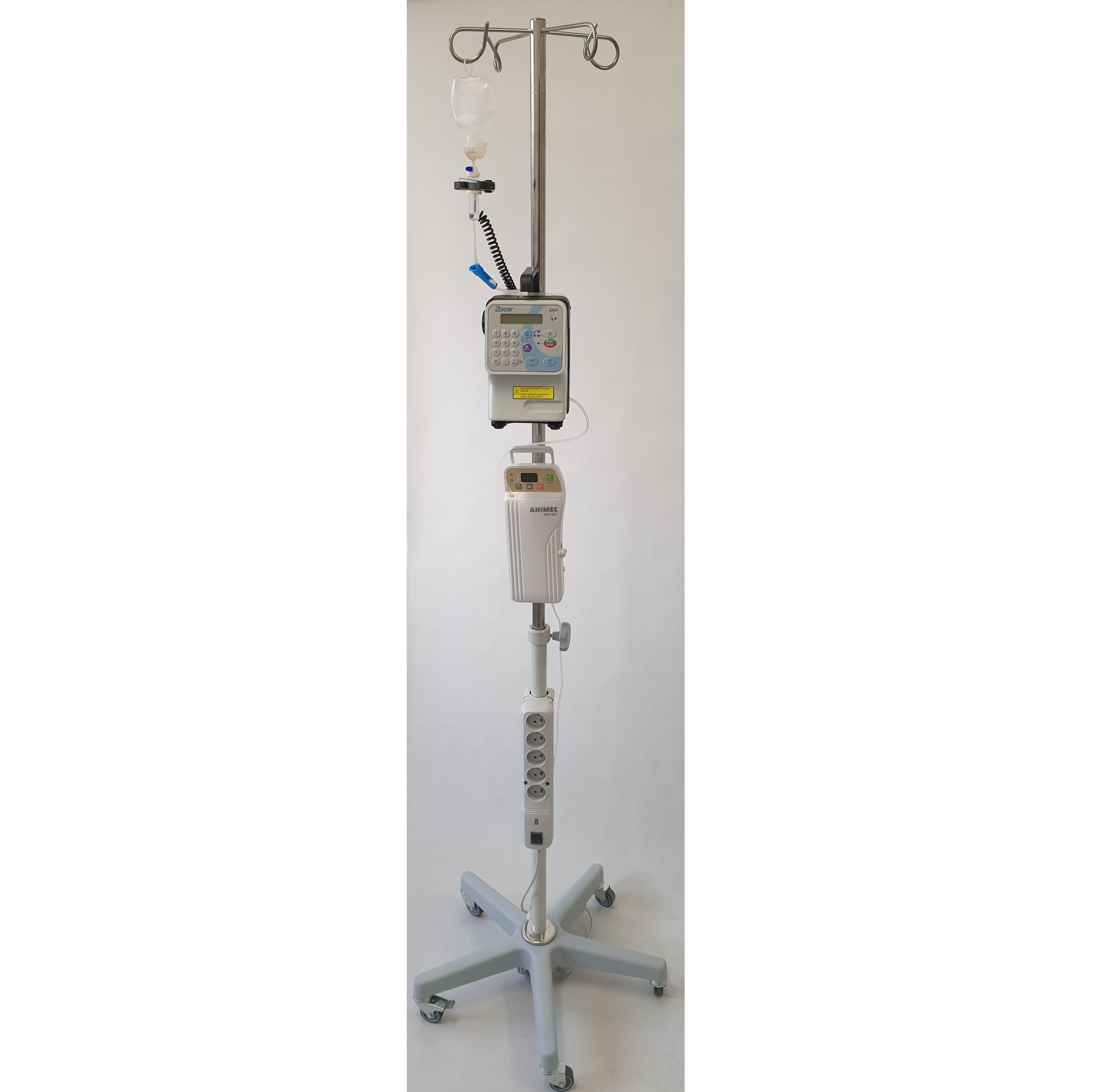 Statyw medyczny systemu AS przeznaczony do mocowania pomp infuzyjnych oraz innych urządzeń medycznych. Elementy systemu: pięcioramienna podstawa, rura wysoka lub niska, półka, uchwyt - rączka, pojemnik - kosz, zbiorniczek pomocniczy - zlewka. Statyw AS to: stabilność konstrukcji, funkcjonalność, estetyka.