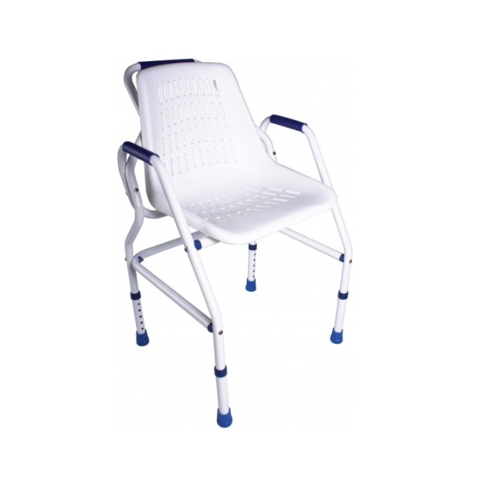 Fotel prysznicowy ATLANTIS z regulacją wysokośći siedziska w zakresie od 48 do 58 cm. Rama fotela wykonana została z aluminium pokrytego farbą epoksydową zabezpieczającą przed rdzą. Połączenia śrubowe wykonane ze stali nierdzewnej. Fotel posiada nasadki atypoślizgowe na nóżkach.