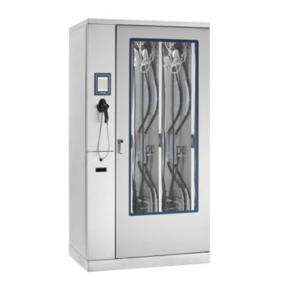 Szafa na endoskopy wentylowana wykonana została ze stali nierdzewnej AISI 304. Drzwi przednie z ramą również wykonane ze stali nierdzewnej i powierzchnią ze szkła hartowanego z silikonową uszczelką na krawędzi. Szafa na łącznie 12 endoskopów w 3 pionowych panelach do przechowywania