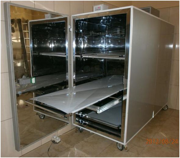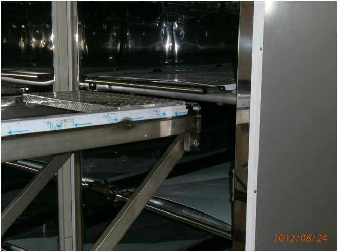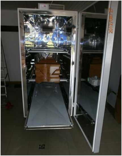 Komory chłodnicze wykonane są z paneli wypełnionych materiałem izolacyjnym. Wewnętrzna powierzchnia komory pokryta jest blachą nierdzewną H17, zewnętrzna – blachą ocynkowaną, lakierowana w dwóch kolorach (biała, srebrna). Wewnątrz komory znajdują się wózki zasadnicze i pomocnicze umożliwiające wygodne wsuwanie i wysuwanie trumien lub tac. Tace wykonane ze stali kwasoodpornej są dodatkowym wyposażeniem komory(cena tacy- 750,00zł netto),służą do przenoszenia ciał i przechowywania ich w komorze. Drzwi komory zamykane są na zamek zatrzaskowy zamykany na klucz z możliwością otwarcia go od środka. Wewnątrz komory na jej tylnej ścianie instalowana jest chłodnica powietrza, na dachu, z tyłu lub z boku komory montowany jest agregat chłodniczy. Agregaty zasilane są prądem jednofazowym o napięciu 230V i częstotliwości 50Hz. Zespół instalacji chłodniczej i elektrycznej zapewnia automatyczną realizację procesu chłodzenia i utrzymywania zadanej temperatury w zakresie od 0ºC do +10ºC.