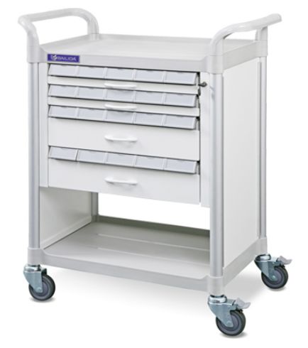 Wózek do przewozu i przechowywania leków. Wymiary szuflad: 2 x 7,6 + 2 x 15,1cm. Szuflady otwierane dwustronnie (przód/tył). Funkcja samoczynnego powrotu szuflad zapewnia płynna pracę szuflad. Wytrzymałe pozwalające na wygodne manewry koła z plastiku TPR z blokadą. Centralny zamek zabezpieczający szuflady. Liczba i rozmiar szuflad mogą być dobrane indywidualnie.