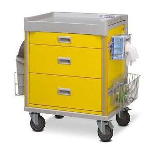 Wózek opatrunkowy (3 szuflady) może być na różne sposoby konfigurowany. Posiada w standardzie: pojemnik na rękawiczki, zamykany kosz na odpady, uniwersalny koszyk. Dodatkowe akcesoria: nadstawka umieszczona na wysięgniku z uchylnymi pojemnikami na leki, regulowany wieszak na płyny infuzyjne, pojemnik na zużyte materiały: igły, strzykawki, probówki, pojemnik odporny na przekłucie (igły ostrza), samoczynne domykanie szuflad. Podstawowe opcje kolorystyczne: biały, czerwony, żółty, niebieski. Możliwość zamówienia wersji kolorystycznych na oddziały pediatryczne (zdjęcie nr 2).
