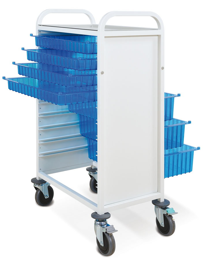 Otwarty wózek do przewozu leków. Szuflady umieszczone w jednej kolumnie. Wózek z niebieskimi tacami a tworzywa ABS. tace o różnych wysokościach, z możliwością otwierania z dwóch stron. Wózek z odbojnikami przy kółkach. Specialnie zaprojetowane odbojniki chronią użytkownika i wózek.