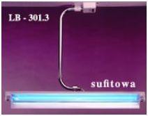 Lampy bakteriobójcze LB-301 z jednym i dwoma promiennikami, charakteryzujące się bardzo dużą skutecznością działania, przewidziane są do stosowania wszędzie tam, gdzie wymagana jest wysoka sterylność powietrza m.in. w salach operacyjnych i przedoperacyjnych, gabinetach zabiegowych, przy produkcji żywności, leków, surowic, szczepionek itp. Praktyka stosowania lamp bakteriobójczych do dezynfekcji pomieszczeń wskazuje, że najlepsze wyniki uzyskuje się przez napromieniowanie górnych warstw powietrza. Prądy powietrza powodują wymieszanie czystego powietrza z górnej części pomieszczenia z zanieczyszczonym powietrzem dolnych poziomów, dając w ten sposób małe stężenia bakterii na poziomie oddychania. Dobór rodzaju oraz ilości lamp dla danego pomieszczenia zależy od bardzo wielu czynników, i tak m.in.: od jego wielkości, warunków otoczenia (wilgotności i temperatury), stopnia zapylenia powietrza i jego fluktuacji, a nawet od rodzaju farby pokrywającej ściany. Z praktyki wynika, iż jedna lampa o mocy 30WW powinna przypadać na jedno pomieszczenie o objętości do 45m3, a lampa o mocy 60W na pomieszczenie do 60 m3 , jednak ze względu na bardzo dużą różnicę w odporności poszczególnych mikroorganizmów na promieniowanie UV, oraz wcześniej wymienione czynniki, czas naświetlania pomieszczeń może być bardzo zróżnicowany. Dla określenia momentu wymiany promienników prowadzi się specjalne rejestry lub, na życzenie użytkownika, wyposaża się lampy w liczniki, które sumują elektronicznie czas pracy promienników i pokazują go na wyświetlaczu. DANE TECHNICZNE: LB-301.3 2x30. Napięcie zasilania 230V ; 50Hz. Moc promienników 2 x 30W. Moc pobierana 165 VA. Trwałość promienników 8000h. Natężenie promieniowania z odległości 1m 450 µW/cm2. Rodzaj ochrony przed porażeniem elektrycznym: I . Masa: - lampa sufitowa 4,6 kg.