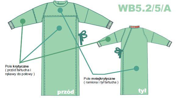 Fartuch operacyjny standardowego ryzyka WB 5.2/5/A składa się z dwóch części - pola krytycznego (gramatura 135g/m2, skład: 98% poliester+ 2% włókno węglowe), oraz pola mniej krytycznego (gramatura 125g/m2, skład: 44% poliester + 54,6% bawełna + 1,4% włókno węglowe). Przód i rękawy fartucha wykończone hydrofobowo. Temperatura prania 70 st.C, temperatura sterylizacji 134 st.C. Dostępny w rozmiarach M, L, XL, XXL. Występuje w kolorach: zielony oraz niebieski.