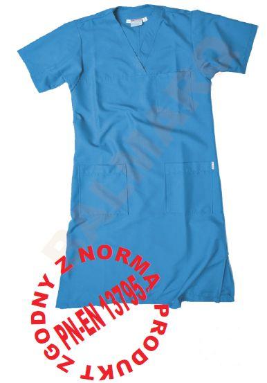 Sukienka operacyjna ANTYBAKTERYJNA WB 5.8/1 występuje w rozmiarach od S do XXL, oraz w kolorach: biały, niebieski, zielony, czerwony. Skład tkaniny: 40% poliester + 60% bawełna, gramatura 205 g/m2.