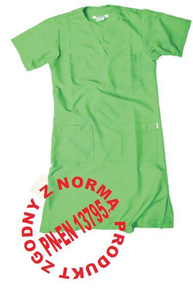 Sukienka operacyjna WB 5.8/1/A występuje w rozmiarach od S do XXL, oraz w kolorach: szafirowy, niebieski, zielony, czerwony, granatowy. Skład tkaniny: 44% poliester + 54,6% bawełna + 1,4% włókno węglowe, gramatura 125 g/m2.