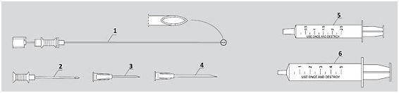 Zestaw do znieczulenia podpajęczynówkowego i z igłą standard. Elementy zestawu: 1. igła podpajęczynówkowa STANDARD (ostrze typ Quincke), 2. igła prowadząca, 3. igła do znieczuleń 0.5 x 25 mm, 4. igła do podawania leków 0.9 x 40 mm, 5. strzykawka 2.5 ml, 6. strzykawka 5 ml.