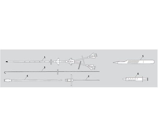 Zestaw do kaniulacji dużych naczyń metodą Seldingera, dwukanałowy.Elementy zestawu: 1. kateter, 2. igła, 3. prowadnik, 4. rozszerzacz (dilatator), 5. skalpel, 6. strzykawka 5 ml - dla rozmiaru 5F 10 ml - dla rozmiarów od 6F do 11F.