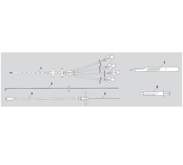 Zestaw do kaniulacji dużych naczyń metodą Seldingera, czterokanałowy. Elementy zestawu: 1. kateter, 2. igła, 3. prowadnik, 4. rozszerzacz (dilatator), 5. skalpel, 6. strzykawka 10 ml.