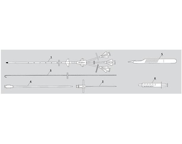 Zestaw do kaniulacji dużych naczyń metodą Seldingera, trzykanałowy.Elementy zestawu: 1. kateter, 2. igła, 3. prowadnik, 4. rozszerzacz (dilatator), 5. skalpel, 6. strzykawka 5 ml - dla rozmiaru 5F 10 ml - dla rozmiarów od 6F do 11F.