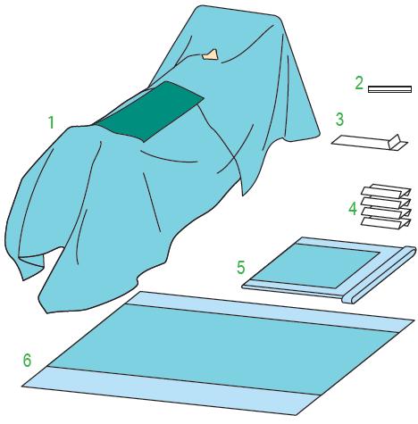 o wymiarach 11x11 cm 200/280x350 cm - 1 sztuka; tasma samoprzylepna typu RZEP 2,5x30 cm - 1 sztuka; taśma samoprzylepna 9x49 cm - 1 sztuka; ręczniki chłonne 18x25 cm - 4 sztuki; osłona na stolik MAYO 79x145 cm - 1 sztuka; serweta na stolik (owinięcie zestawu) 150x190 cm - 1 sztuka. Zestaw sterylny. Ilość sztuk w opakowaniu "podajnik"/ilość sztuk w opakowaniu transportowym: 7/14.