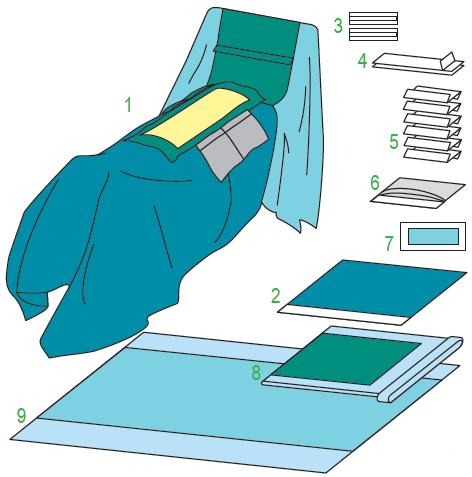 chłonną z możliwością zamocowania drenów 200/300x340 - 1 sztuka; serweta z taśmą samoprzylepną 75x75 - 1 sztuka; taśma samoprzylepna typu RZEP 2,5x30 cm - 2 sztuki; taśma samoprzylepna 9x49 cm - 2 sztuki; ręczniki chłonne 18x25 cm - 6 sztuk; kieszeń samoprzylepna jednokomorowa 33x38 cm - 1 sztuka; osłona na krocze 18x43 cm - 1 sztuka; wzmocniona osłona na stolik MAYO 79x145 cm - 1 sztuka; serweta na stolik - (owinięcie zestawu) 150x240 cm - 1 sztuka.