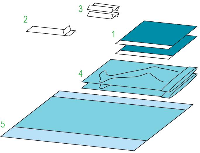 Elementy zestawu: serwety chirurgiczne samoprzylepne 75x75 cm - 2 sztuki; taśma samoprzylepna 9x49 - 1 sztuka; ręczniki chłonne 18x25 cm - 2 sztuki; osłony na kończyny 75x120 - 2 sztuki; serweta na stolik - (owinięcie zestawu) 150x190 cm - 1 sztuka. Zestaw sterylny. Ilość sztuk w opakowaniu "podajnik"/Ilość sztuk w opakowaniu transportowym: 11/12.