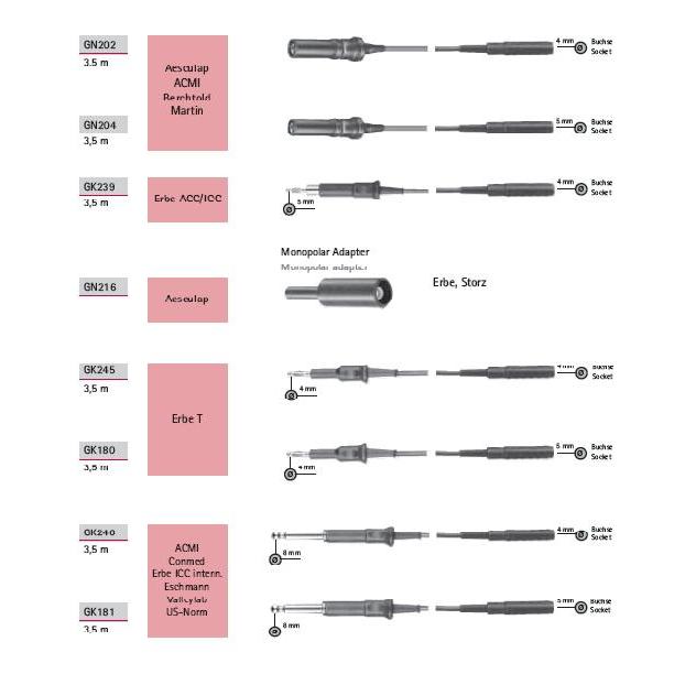 Kabel do uchwytu elektrody chirurgicznej o długości 3,5 m, o średnicy złącza 4 mm od strony instrumentu i 8 mm od strony urządzenia (GK246) oraz 5 mm od strony urządzenia i 8 mm od strony instrumentu (GK181). Produkt kompatybilny z urządzeniami: ACMI, Conmed, Erbe ICC intern, Eschmann, Valleylab, US-Norm.