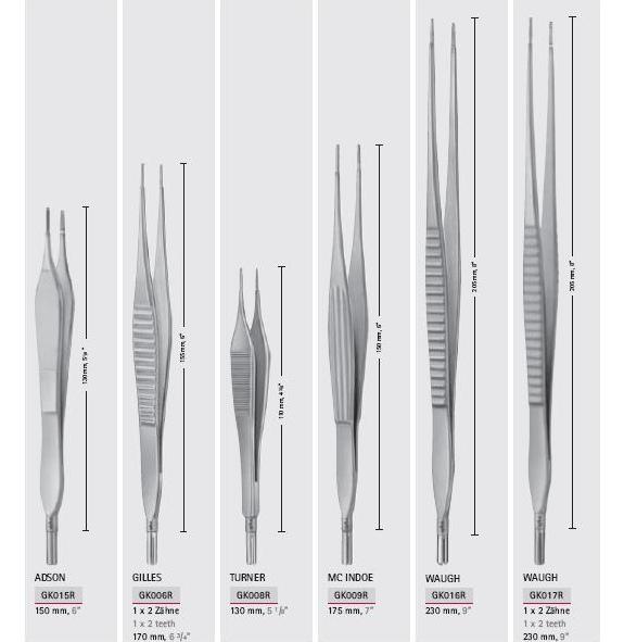 Pęseta anatomiczna o długościach odpowiednio: 200 mm, 240 mm, 300 mm.