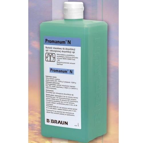 Promanum® N to gotowy do użycia alkoholowy preparat do chirurgicznej i higienicznej dezynfekcji rąk przeznaczony do lekko przetłuszczającej się skóry. Skład substancji czynnych Promanum® N gwarantuje bardzo szybki efekt działania – zaledwie 2 minuty czasu reakcji preparatu są wystarczające do chirurgicznej dezynfekcji rąk i związanej z tym redukcji liczby mikroorganizmów o 99 %. Jednocześnie, obserwuje się silny efekt przedłużonego działania – 95 % redukcja mikroorganizmów w 3 godz. po zastosowaniu preparatu. Ze względu na wyjątkowo wysoką skuteczność przeciwko wieloopornym stafylokokom, Promanum® N jest szczególnie rekomendowany w profilaktyce MRSA. Brak dodatkowych substancji czynnych oraz zawartość substancji pielęgnujących skórę zapewniają łagodne oddziaływanie na skórę rąk. Promanum N® reprezentuje linię produktów B/Braun przeznaczoną do całościowej skutecznej pielęgnacji, ochrony, mycia i dezynfekcji rąk. Obok Promanum® N są to: emulsja pielęgnująca Trixo® i emulsja myjąca Lifosan Soft®. Linia ta jest szczególnie rekomendowana dla osób o skórze normalnej i lekko tłustej. Długookresowe stosowanie tej linii kosmetycznodezynfekującej gwarantuje najwyższą jakość procesu dezynfekcji rąk z użyciem preparatu Promanum® N.