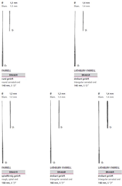 - BN468R - watotrzymacz o średnicy 1,4 mm i długości 160 mm; trójkątna, ząbkowana końcówka