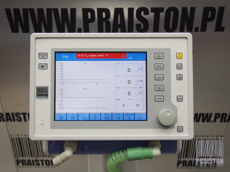 - Alarm: awaria O2, awaria powietrza, limit MV / niskie, górna granica Vt, górna granica Fspont, górna / dolna wartość Paw, bezdech, limit FiO2 / niskie, awaria zasilania,