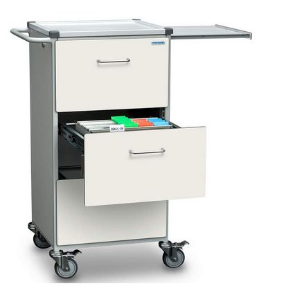 Powierzchnie wózków WIEGAND® "Flexline" są wykonane z trwałych i pełnowartościowych płyt żywicznych. Przekonuje ich prosty i ponadczasowy wygląd. 10 standardowych kolorów - od intensywnych, świeżych do subtelnych pastelowych odcieni - spełniają większość życzen naszych klientów. Mogą również Państwo wybrać spośród ponad 250 specialnych kolorów i dekoracji. Blat: z+amykany (opcja); wykonany ze stali nierdzewnej INOX (opcja); bez profilowanej powierzchni (opcja); galeria (opcja); Szuflady: wysokość frontów: 60, 90, 120, 150, 180, 210, 240, 270, 300mm; blokada szuflady, centralny zamek lub pojedyńcze zamknięcie (wszystkie opcjonalnie), wiele wariantów dzielenia wewnątrz i ułożenia, otwieranie przez delikatne naciśnięcie "push to open" bez uchwytów (opcja), średnica kół : 75mm, 100mm i 125mm, specialny rodzaj gumy zapewniający cichą pracę kółek, nakładka dystansowa, obracająca się swobodnie (opcjonalnie), antystatyczne koła (opcja), koła plastikowe (opcja); Drzwi: 6mm pełne, zamykane, dostępne różne systemy zamków/zamykania drzwi, rolety (opcjonalnie), drzwi szklane wykonane ze szkła bezpiecznego (opcjonalnie); Wysuwany blat roboczy: możliwość wydłużenia blatu na stronach, obciążenie do 15 kg; Wysuwany do przodu (opcjonalnie). Rama wózka wykonana z metalu, wszystkie powierzchnie i powłoki w tym profilowany blat ABS pokryte antybakteryjnymi jonami srebra tzw. powłoką Sanitized ® antybakteryjną zapobiegającą rozwojowi bakterii i grzybów, powierzchnie trwałe i odporne na zmywanie, wózek mobilny posiadający 4 chromowane kółka o średnicy 100 mm, dwa z nich z blokadą, wyposażony w 3 szuflady zamykane na zamek centralny, wysuwany blat roboczy boczny z prawej strony, o dopuszczalnym obciązeniu 15 kg, szuflady i moduły montowane na systemie rolkowym (środek zabudowany w system do podwieszenia kart pacjenta wiszący).