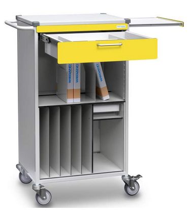 Powierzchnie wózków WIEGAND® "Flexline" są wykonane z trwałych i pełnowartościowych płyt żywicznych. Przekonuje ich prosty i ponadczasowy wygląd. 10 standardowych kolorów - od intensywnych, świeżych do subtelnych pastelowych odcieni - spełniają większość życzen naszych klientów. Mogą również Państwo wybrać spośród ponad 250 specialnych kolorów i dekoracji. Blat: z+amykany (opcja); wykonany ze stali nierdzewnej INOX (opcja); bez profilowanej powierzchni (opcja); galeria (opcja); Szuflady: wysokość frontów: 60, 90, 120, 150, 180, 210, 240, 270, 300mm; blokada szuflady, centralny zamek lub pojedyńcze zamknięcie (wszystkie opcjonalnie), wiele wariantów dzielenia wewnątrz i ułożenia, otwieranie przez delikatne naciśnięcie "push to open" bez uchwytów (opcja), średnica kół : 75mm, 100mm i 125mm, specialny rodzaj gumy zapewniający cichą pracę kółek, nakładka dystansowa, obracająca się swobodnie (opcjonalnie), antystatyczne koła (opcja), koła plastikowe (opcja); Drzwi: 6mm pełne, zamykane, dostępne różne systemy zamków/zamykania drzwi, rolety (opcjonalnie), drzwi szklane wykonane ze szkła bezpiecznego (opcjonalnie); Wysuwany blat roboczy: możliwość wydłużenia blatu na stronach, obciążenie do 15 kg; Wysuwany do przodu (opcjonalnie). Rama wózka wykonana z metalu, wszystkie powierzchnie i powłoki w tym blat ABS pokryte antybakteryjnymi jonami srebra tzw. powłoką Sanitized ® antybakteryjną zapobiegającą rozwojowi bakterii i grzybów, powierzchnie trwałe i odporne na zmywanie, wózek otwarty mobilny posiadający 4 chromowane kółka o średnicy 100 mm, dwa z nich z blokadą, wyposażony w szufladę oraz segmenty na dokumenty, wysuwany blat roboczy boczny z prawej strony, o dopuszczalnym obciązeniu 15 kg.