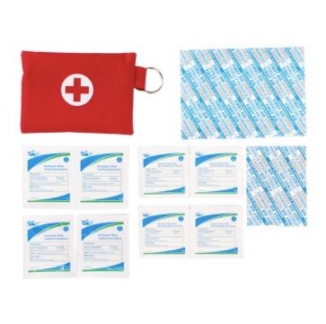 Apteczka podręczna zawierająca podstawowe artykuły niezbędne do udzielenia pierwszej pomocy w czasie podróży, pieszych wędrówek czy wakacji. W jej skład wchodzą: chusteczki nasączone alkoholem 4 szt., chusteczki antyseptyczne 4 szt., bandaż samoprzylepny 72*19mm 4 szt., bandaż samoprzylepny 56*19mm 4szt.