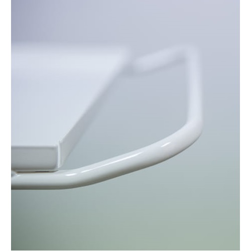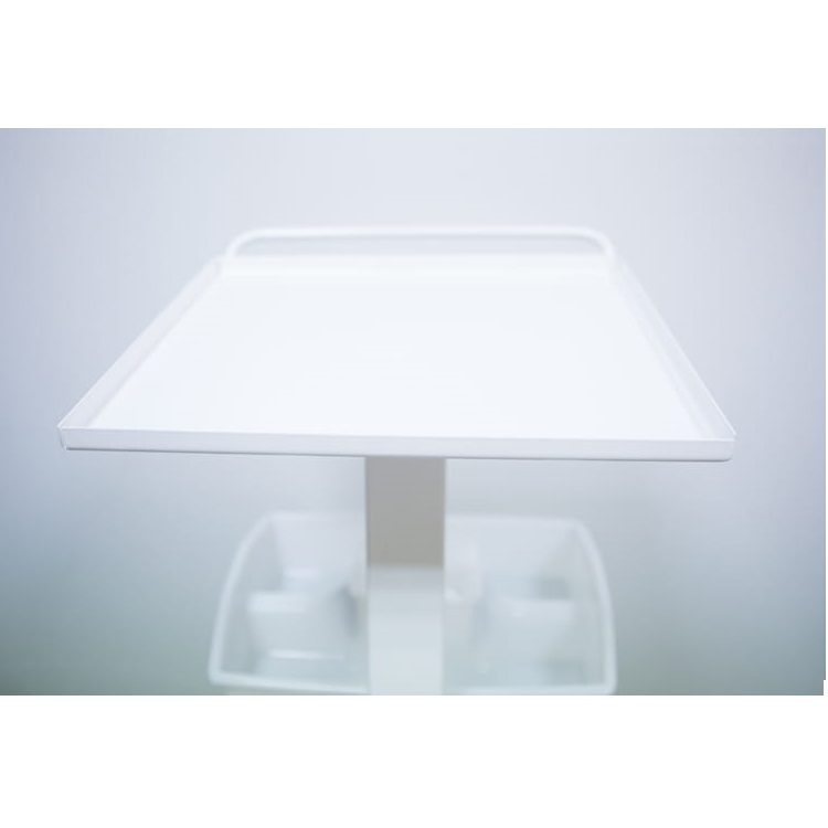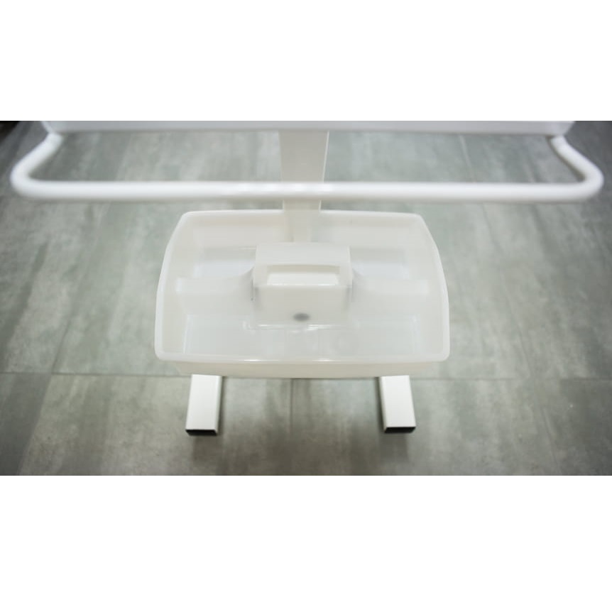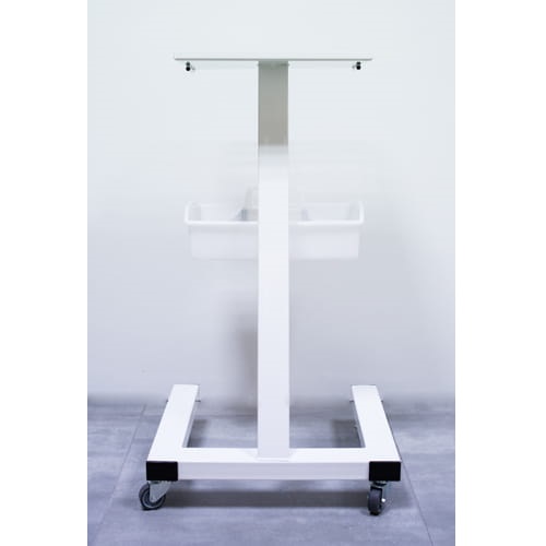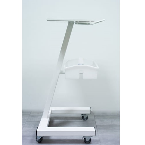 Wykonany ze stali, posiada kółka wykończone gumą. Dwa kółka obrotowe z hamulcem. W zestawie plastikowy pojemnik na akcesoria oraz uchwyt do kabli EKG (chwyt dostępny w modelu do aparatów EKG). Ergonomiczna rączka ułatwia przemieszczanie wózka