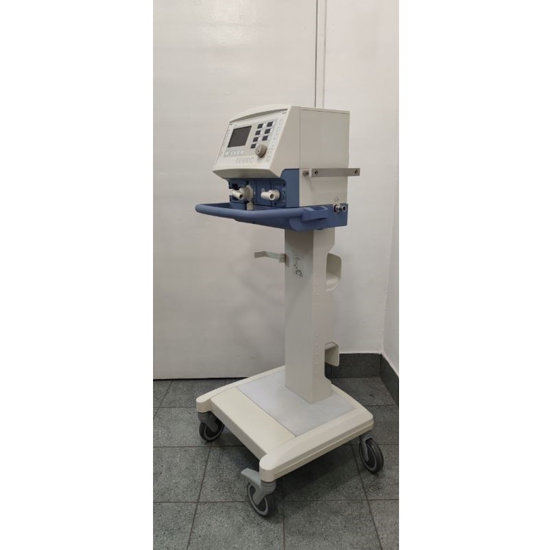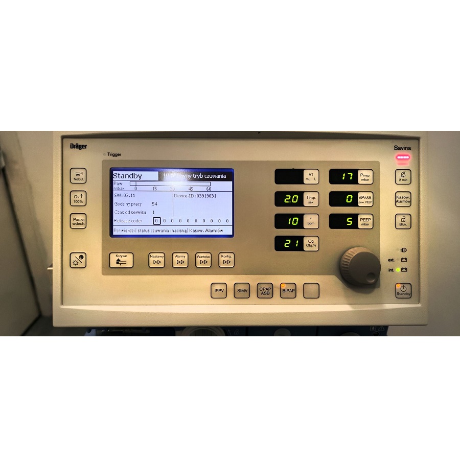 Respirator w bardzo dobrym stanie. Przepracowane zaledwie 54 godziny. Nowe akumulatory. Pracuje w trybie ciśnieniowym, objętościowym, BIPAP.