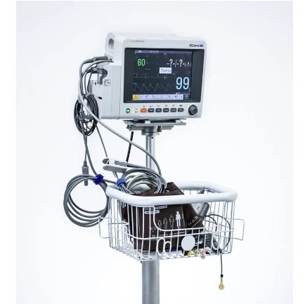 - W zestawie: pułapka wodna, kabel EKG z 5cioma lub 10cioma odprowadzeniami (są wysyłane losowo), przewód NIBP z mankietem, czujnik SpO2 na palec, czujnik temperatury, całość na wózku jezdnym z koszykiem na akcesoria.