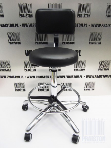 Nowy, powystawowy, Produkcji polskiej (2021r.), Nowa tapicerka z atestem medycznym w kolorze czarnym (możliwość wymiany tapicerki z naszego wzornika kolorów za dodatkową opłatą), Posiada stabilną aluminiową podstawę i wygodne tapicerowane siedzisko oraz praktyczny podnóżek, Regulacja wysokości odbywa się za pomocą sprężyny gazowej, Wyposażony jest w oparcie pleców o wymiarach 35 x 20 cm, Mobilny na kółkach, Parametry Techniczne: Wysokość: 64 - 89 cm, Podstawa: ø 65 cm, Siedzisko: ø 35 cm, Posiada wystawiony aktualny Paszport Techniczny, Gwarancja: 6 miesięcy na rynek krajowy - Polska, 1 miesiąc na rynek międzynarodowy, Możliwość finansowania (tylko Polska): Raty, Leasing, Pożyczka,