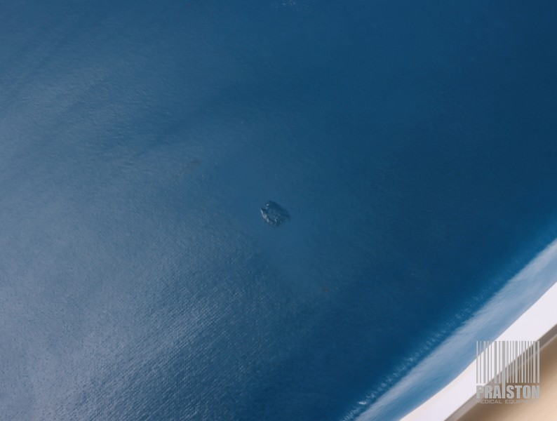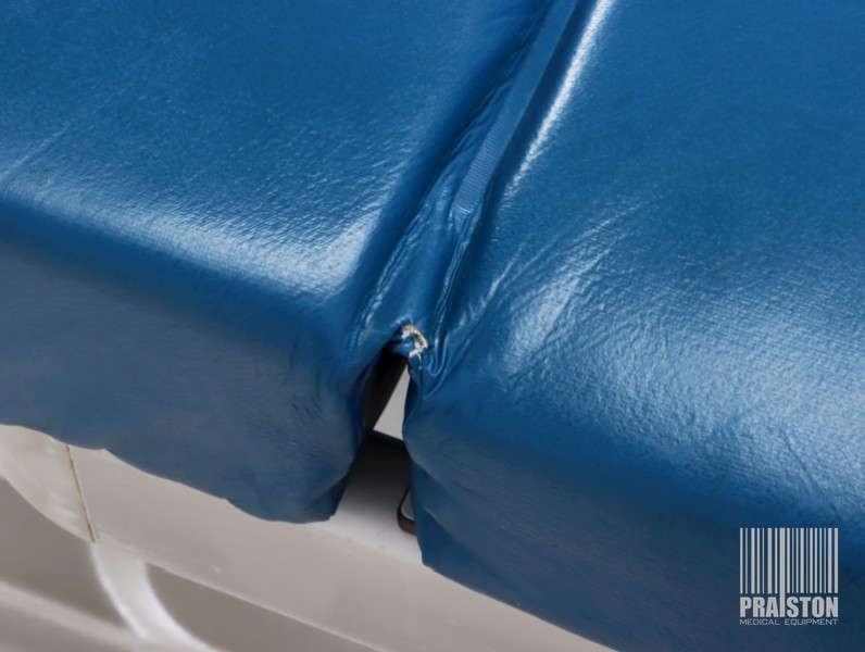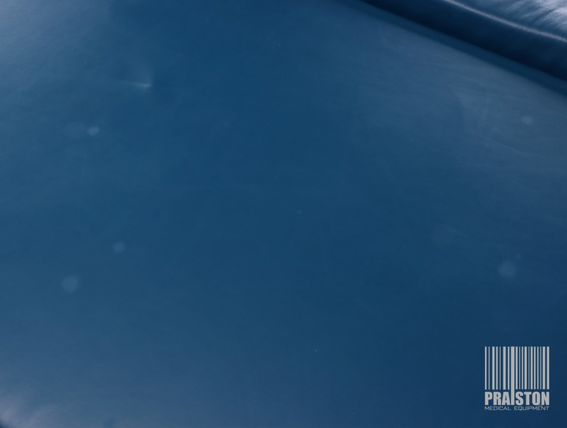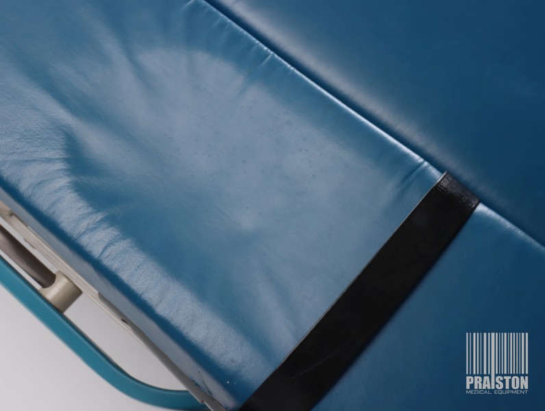 - Tapicerka z atestem medycznym w kolorze niebieskim ze śladami użytkowania widocznymi na zdjęciach (możliwość wymiany tapicerki na nową, z naszego wzornika kolorów za dodatkową opłatą),