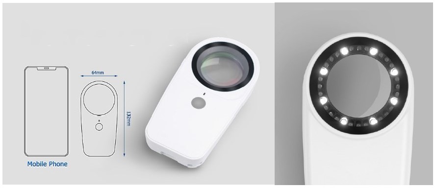 Lekki i kompaktowy dermatoskop kieszonkowy do szybkiego diagnozowania różnych chorób skóry. Urządzenie diagnostyczne dla dermatologów, lekarzu ogólnych, personelu medycznego, naukowców oraz badaczy z potrzebami obserwacji skóry.