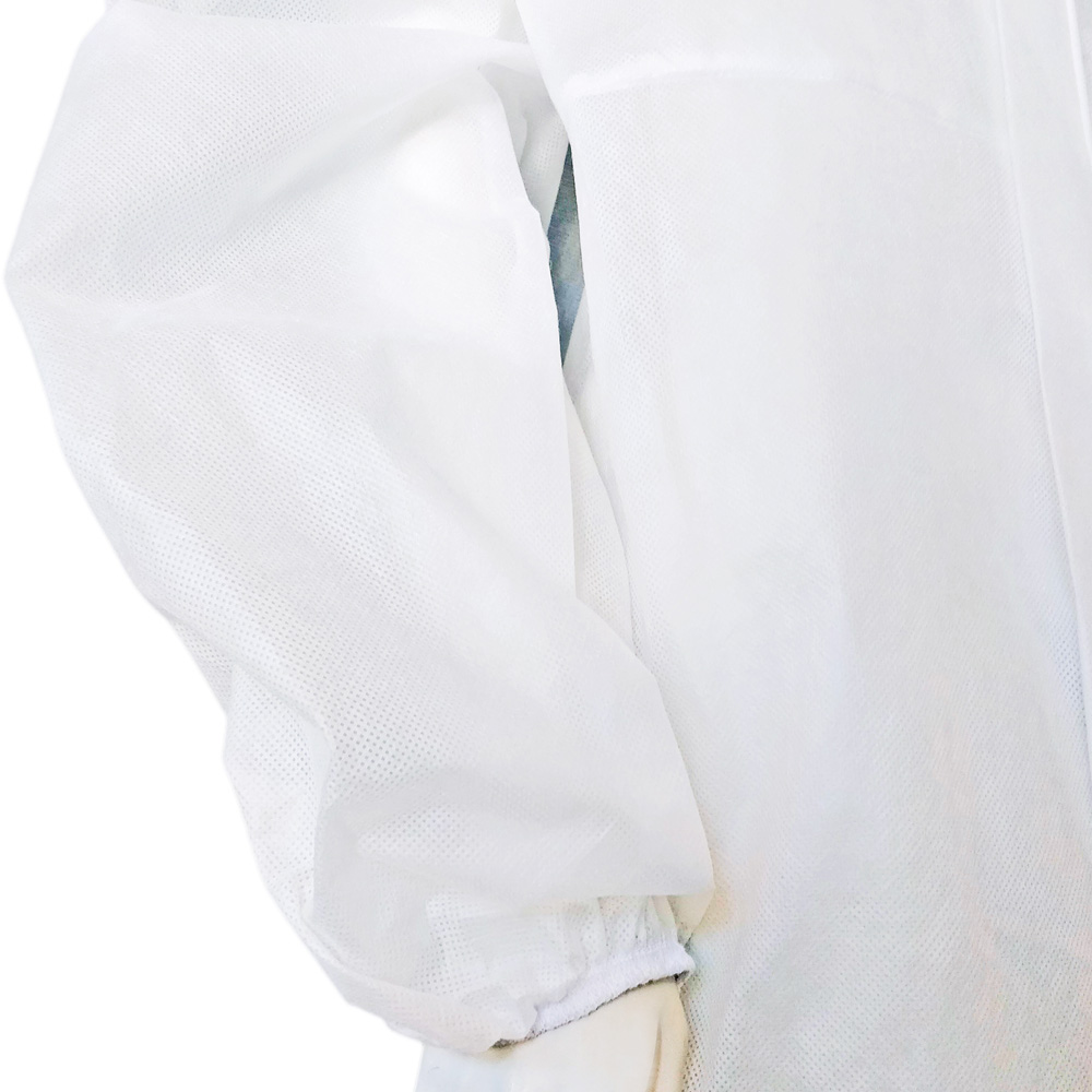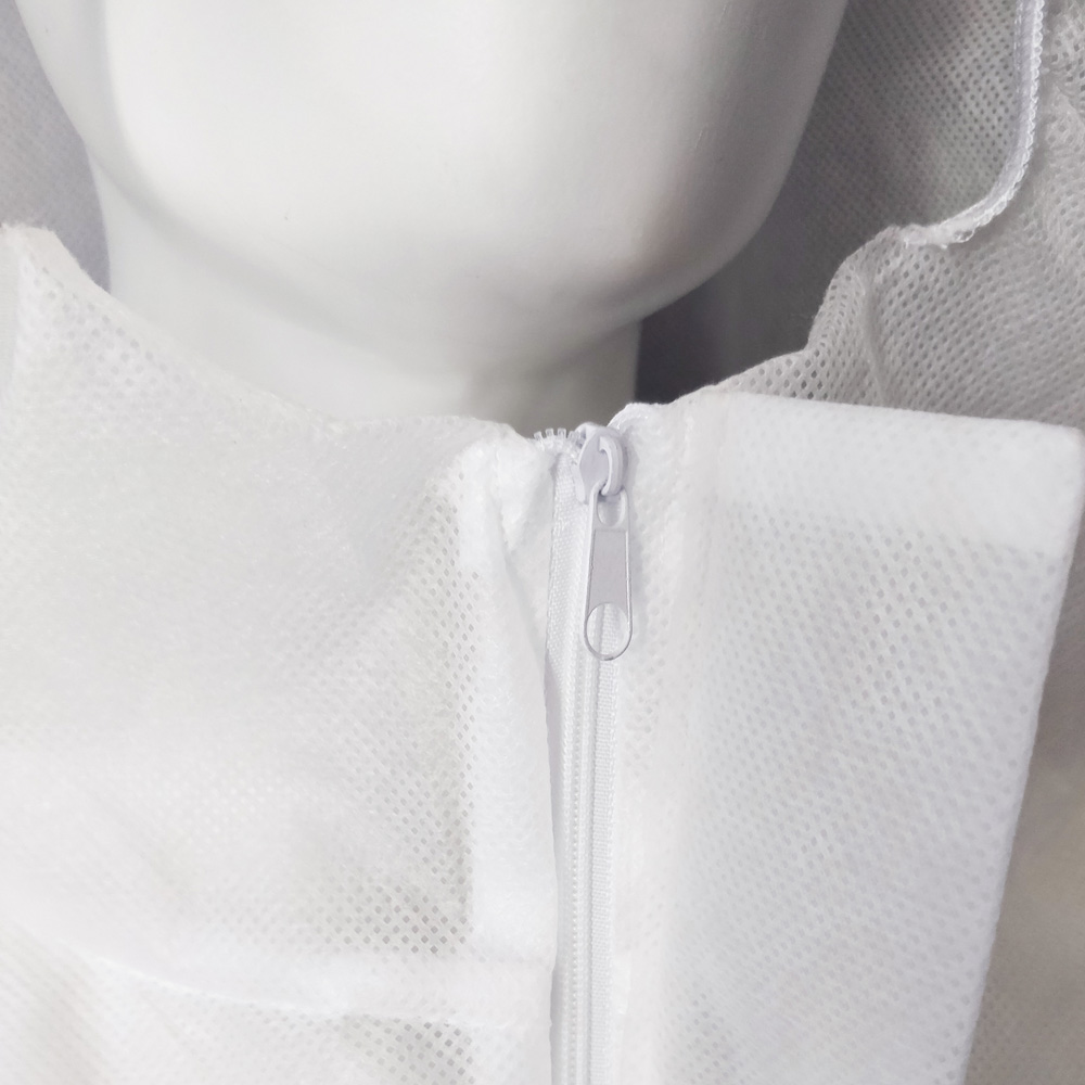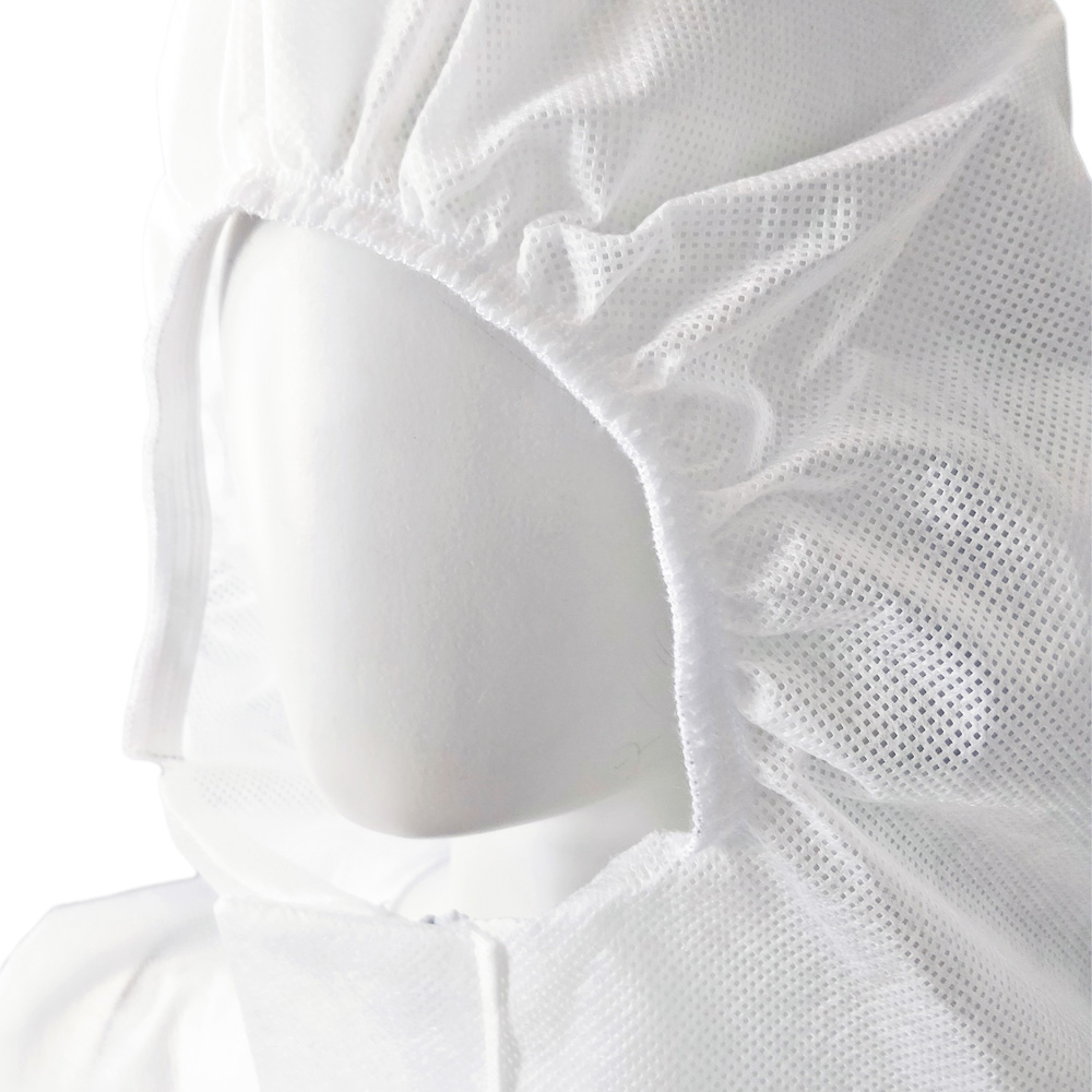 Kombinezon ochronny wykonany z certyfikowanej tkaniny medycznej polipropylenowej, zapinany z przodu na zamek ukryty pod listwą, elastyczna guma w kapturze oraz rękawach i nogawkach umożliwia idealne dopasowanie i przyleganie.