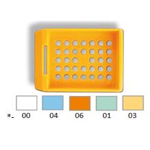 Standardowa kasetka histopatologiczna bez wieczka. 34 okrągłe otwory zapewniają maksymalną wymianę odczynników oraz wysoki stopień przepojenia materiału. Kasetka dostępna jest w różnych kolorach w dwóch opcjach:
