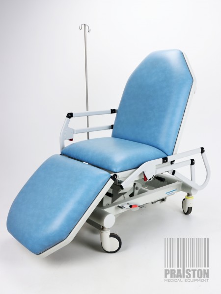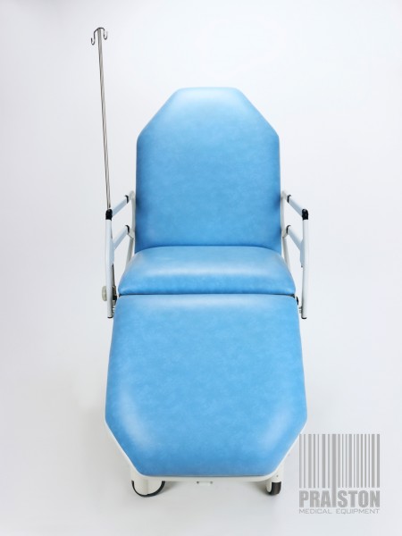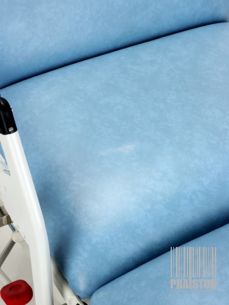 - Tapicerka z atestem medycznym w kolorze niebieskim ze śladami użytkowania w postaci przebarwienia na siedzisku oraz niewielkiego przetarcia (możliwość wymiany tapicerki na nową, z naszego wzornika kolorów za dodatkową opłatą),