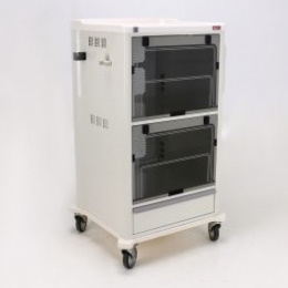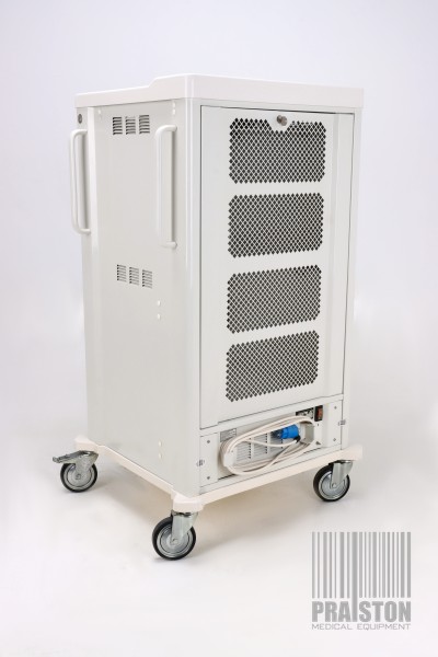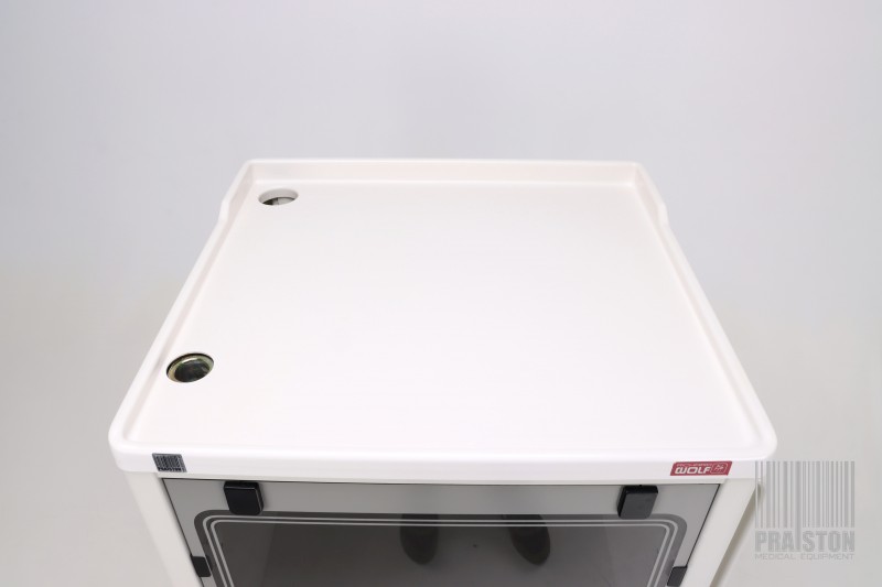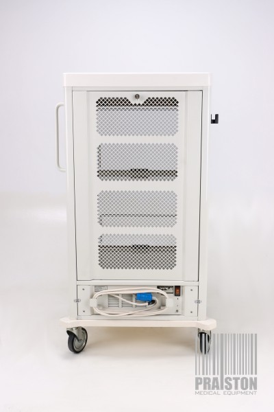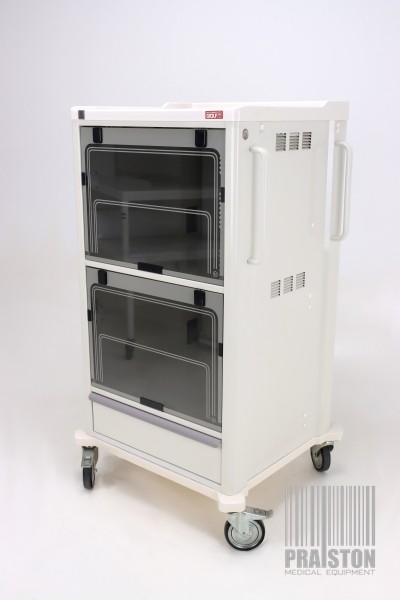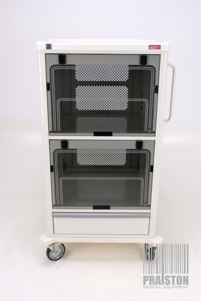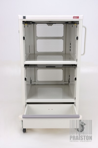 Mobilny wózek endoskopowy Richard Wolf Model 2191.331 przeznaczony w całości do aparatury endoskopowej posiada dwie oddzielne komory oraz dolną wysuwaną szufladę zamykaną na klucz,