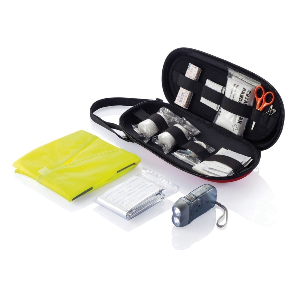 Apteczka samochodowa 47 el., obudowa wykonana z EVA, wewnątrz: kamizelka odblaskowa, latarka na dynamo, srebrny koc termiczny, bandaż trójkątny, bandaże PBT, alkoholowe płatki dezynfekujące, waciki antyseptyczne, chusteczki odświeżające, gaziki non-woven, taśma, plastry, pinezki i nożyczki plastikowe, spełnia wymagania normy EN13485:2003