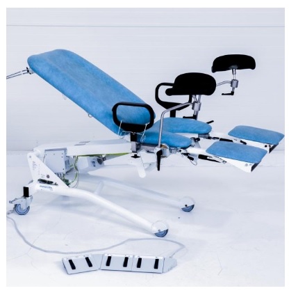 - Elektryczna regulacja fotela za pomocą przełącznika nożnego (wysokość, pochylenie oparcia wraz z siedziskiem)