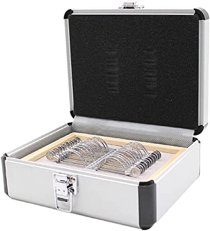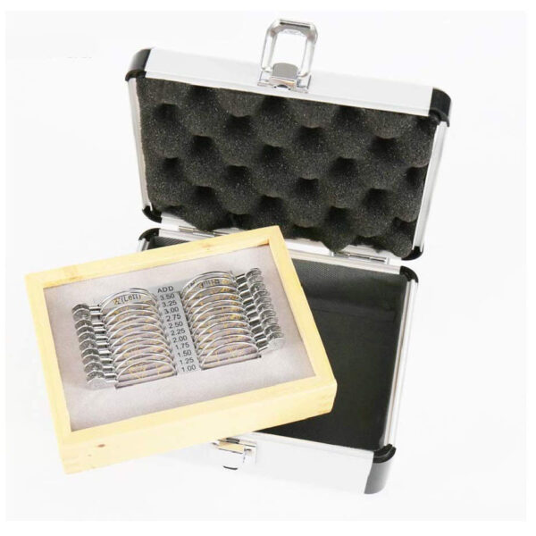 Kaseta 22 szkła próbne progresywne w kasecie metalowej, w metalowej oprawie. Pole widzenia przez soczewkę 36 mm, średnica całkowita soczewki wraz z ramką 38 mm.