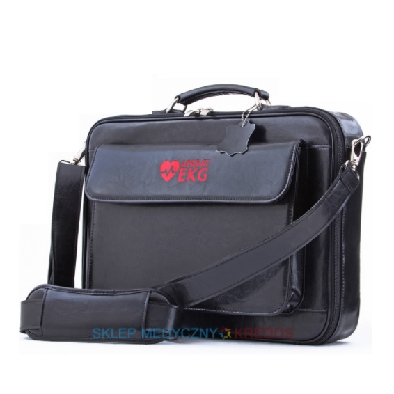 Torba Medyczna pod aparat EKG. Posiada obszerną komorę, która w jednej części jest dostosowana do aparatu EKG (dla ochrony sprzętu ściana i boki torby zabezpieczone są piankową osłoną oraz wyjmowaną pokrywą), a w drugiej części ma miejsce na okablowanie. W modelu tym znajduje się także ruchoma przekładka oddzielająca elektrody i żel. Torba w pokrywie górnej posiada trzy płaskie kieszenie na wydruki EKG, a na zewnątrz dwie kieszenie: po jednej stronie z klapką zamykaną na rzep oraz po drugiej stronie - płaską zamykaną na rzep. Teczka zapinana jest na suwak, posiada również szeroki pas na ramię z przekładką. Na dnie posiada cztery metalowe stopki. Wymiary: 39x29x9 cm. Gwarancja producenta wynosi 24 miesiące.