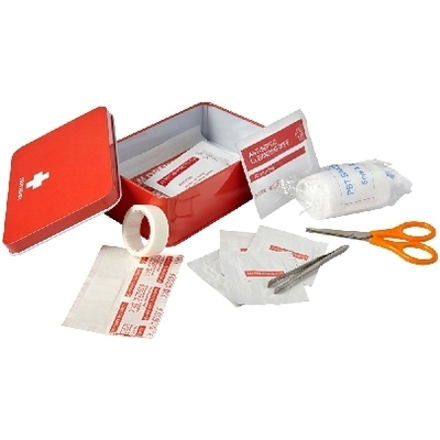Apteczka w puszcze, 15 el., w tym: nożyczki, wilgotna chusteczka, taśma, 4 płatki nasączone alkoholem, 5 plastrów, bandaż i chusteczka antyseptyczna.