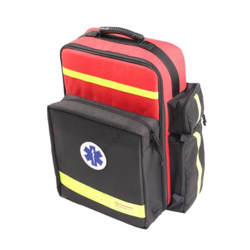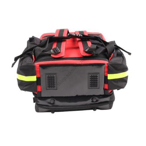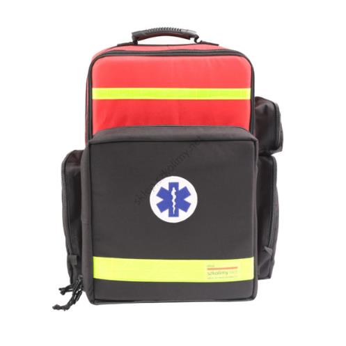 - w przedniej kieszeni frontalnej otwieranej w kształcie litery “C” znajdują się dwie kieszenie siatkowe na zestaw hydrożeli oraz ssak ręczny i rurki ustno-gardłowe,