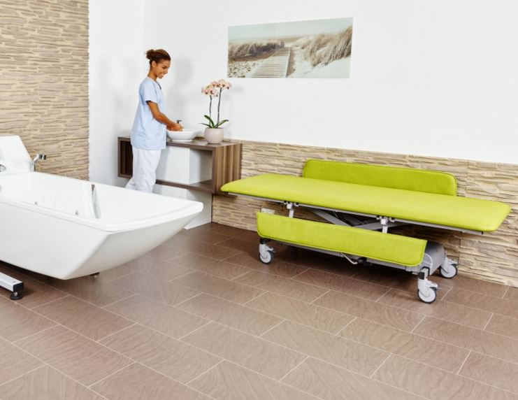 Stół pielęgnacyjny / przewijak MONA to optymalne rozwiązanie mobilne dla pacjentów wymagających szczególnej opieki. Duża powierzchnia leża oraz zaokrąglone krawędzie są bardzo bezpieczne dla chorego. Specjalna tapicerka jest przyjemna dla skóry pacjenta, a jej dodatkowym atutem jest to, że nie marszczy się, nie przesuwa oraz łatwo ją utrzymać w standardach czystości. Urządzenie posiada także możliwość wyposażenia w boczne szyny, które są wytrzymałe na obciążenia, gdyż posiadają mocne metalowe zabezpieczenia. MONA jest łatwa w obsłudze, ponieważ posiada 4 skrętne koła z hamulcami oraz hydrauliczną lub elektryczną możliwość obniżenia, bądź podniesienia stołu.