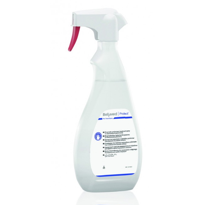 Spray do wstępnego oczyszczania Belimed Protect™ Pre Treat Spray stworzony z myślą o transporcie i tymczasowym przechowywaniu zabrudzonych narzędzi chirurgicznych oraz urządzeń medycznych wielokrotnego użytku przed reprocesowaniem. Informacje producenta :https://www.belimed.com/en/solutions/consumables-protect